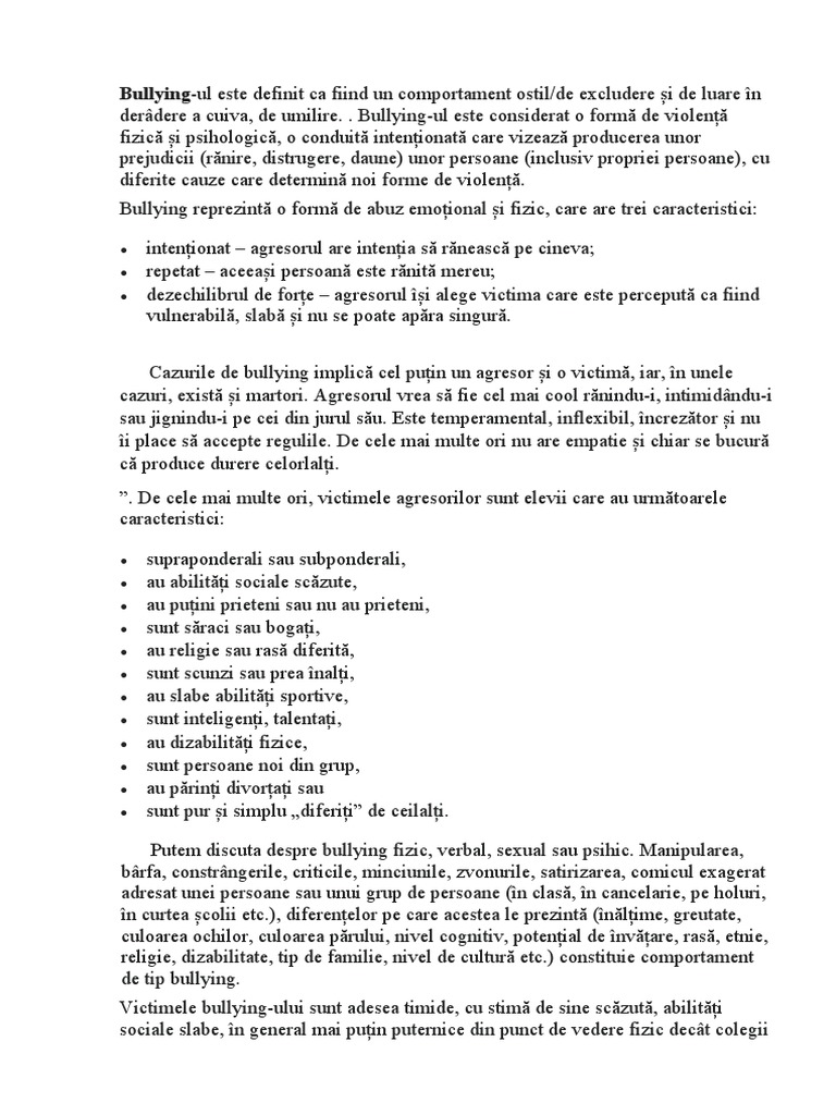 Bullying reprezintă o formă de abuz emoțional și fizic, care are trei caracteristici: