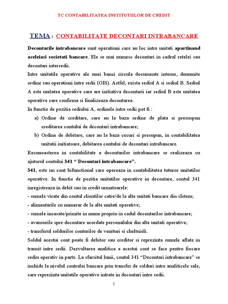 TEMA : CONTABILITATE DECONTARI INTRABANCARE