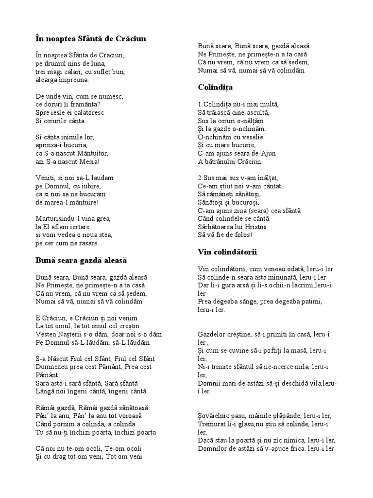 Bună seara, Bună seara, gazdă aleasă Să colinde-n seara asta minunată, leru-i ler