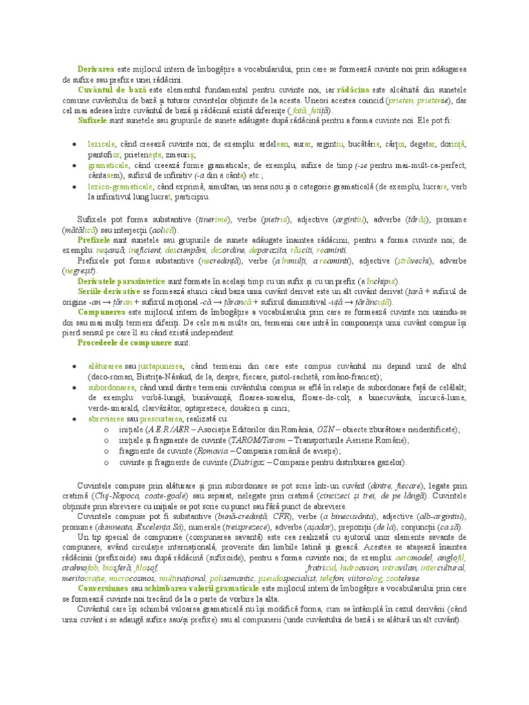 unui cuvânt i se adaugă sufixe sau/și prefixe) sau al compunerii (unde cuvântului de bază i se alătură un alt cuvânt).