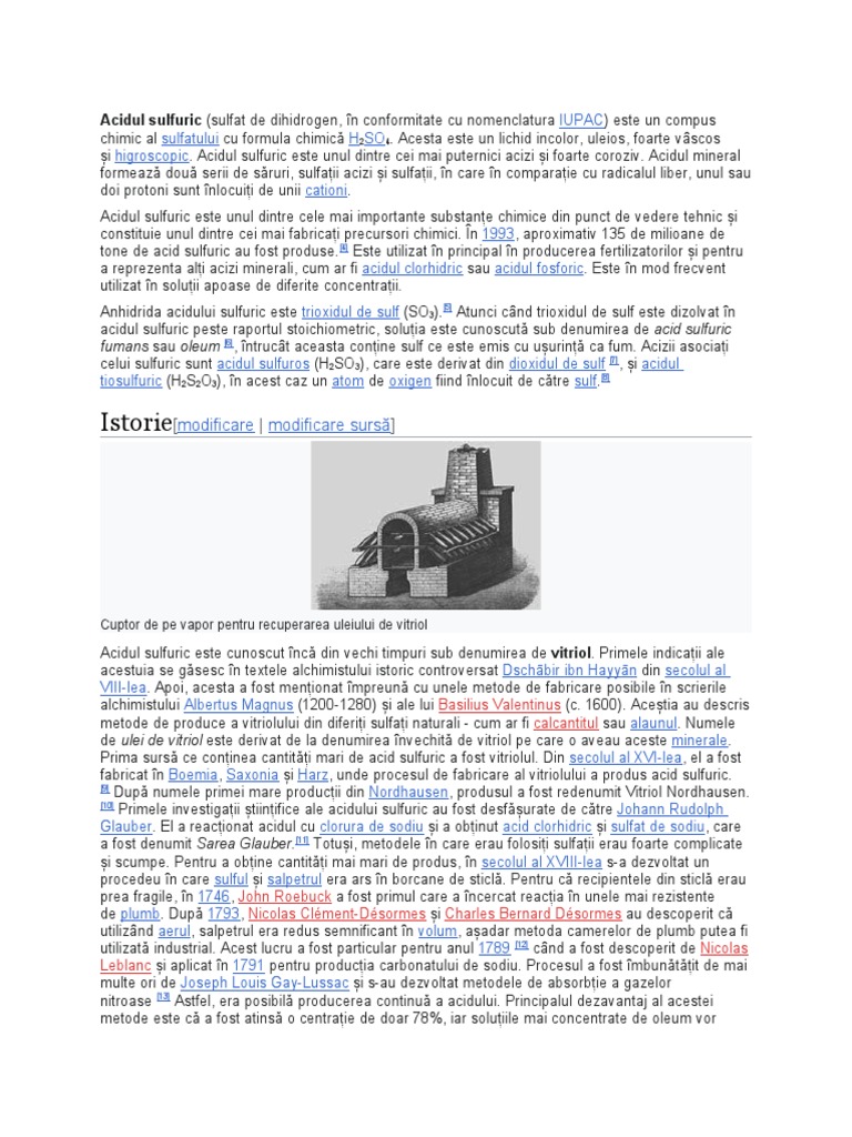 Acidul sulfuric este cunoscut încă din vechi timpuri sub denumirea de vitriol. Primele indicații ale