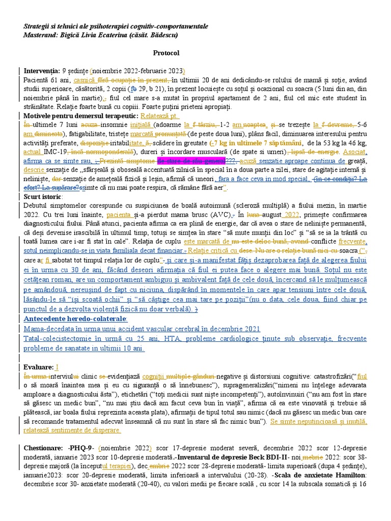 Chestionare: -PHQ-9- (noiembrie 2022) scor 17-depresie moderat severă, decembrie 2022 scor 12-depresie