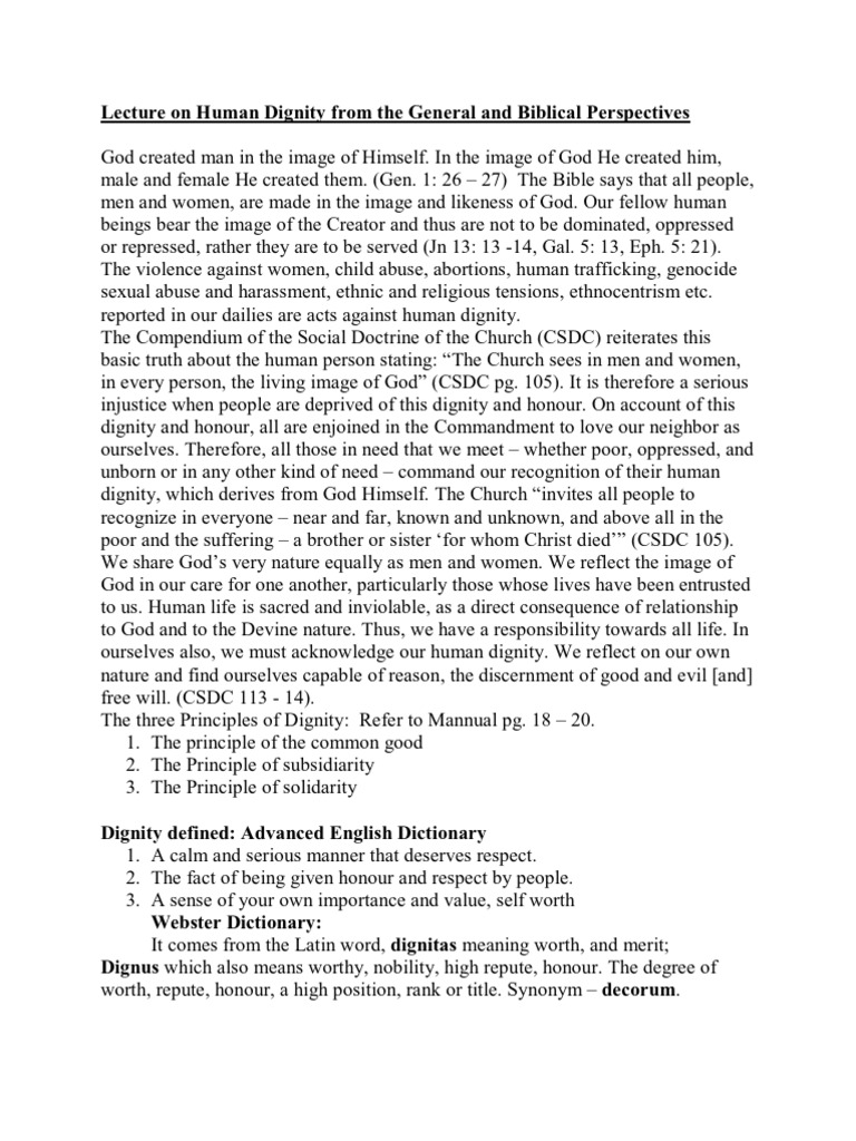 In the image of God He created him, male and female He created them. (Gen. 1: 26 27) The Bible says that all people, men and women, are made in the image and likeness of God. Our fellow human beings bear the image of the Creator and thus are not to be dominated, oppressed or repressed, rather they are to be served (Jn 13: 13 -14, Gal. 5: 13, Eph. 5: 21). The violence against women, child abuse, abortions, human trafficking, genocide sexual abuse and harassment, ethnic and religious tensions, ethnocentrism etc. reported in our dailies are acts against human dignity. The Compendium of the Social Doctrine of the Church (CSDC) reiterates this basic truth about the human person stating: The Church sees in men and women, in every person, the living image of God (CSDC pg. 105). It is therefore a serious injustice when people are deprived of this dignity and honour. On account of this dignity and honour, all are enjoined in the Commandment to love our neighbor as ourselves. Therefore, all those in need that we meet whether poor, oppressed, and unborn or in any other kind of need command our recognition of their human dignity, which derives from God Himself. The Church invites all people to recognize in everyone near and far, known and unknown, and above all in the poor and the suffering a brother or sister for whom Christ died (CSDC 105). We share Gods very nature equally as men and women. We reflect the image of God in our care for one another, particularly those whose lives have been entrusted to us. Human life is sacred and inviolable, as a direct consequence of relationship to God and to the Devine nature. Thus, we have a responsibility towards all life. In ourselves also, we must acknowledge our human dignity. We reflect on our own nature and find ourselves capable of reason, the discernment of good and evil [and] free will. (CSDC 113 - 14). The three Principles of Dignity: Refer to Mannual pg. 18 20. 1. The principle of the common good 2. The Principle of subsidiarity 3. The Principle of solidarity Dignity defined: Advanced English Dictionary 1. A calm and serious manner that deserves respect. 2. The fact of being given honour and respect by people. 3. A sense of your own importance and value, self worth Webster Dictionary: It comes from the Latin word, dignitas meaning worth, and merit; Dignus which also means worthy, nobility, high repute, honour. The degree of worth, repute, honour, a high position, rank or title. Synonym decorum.