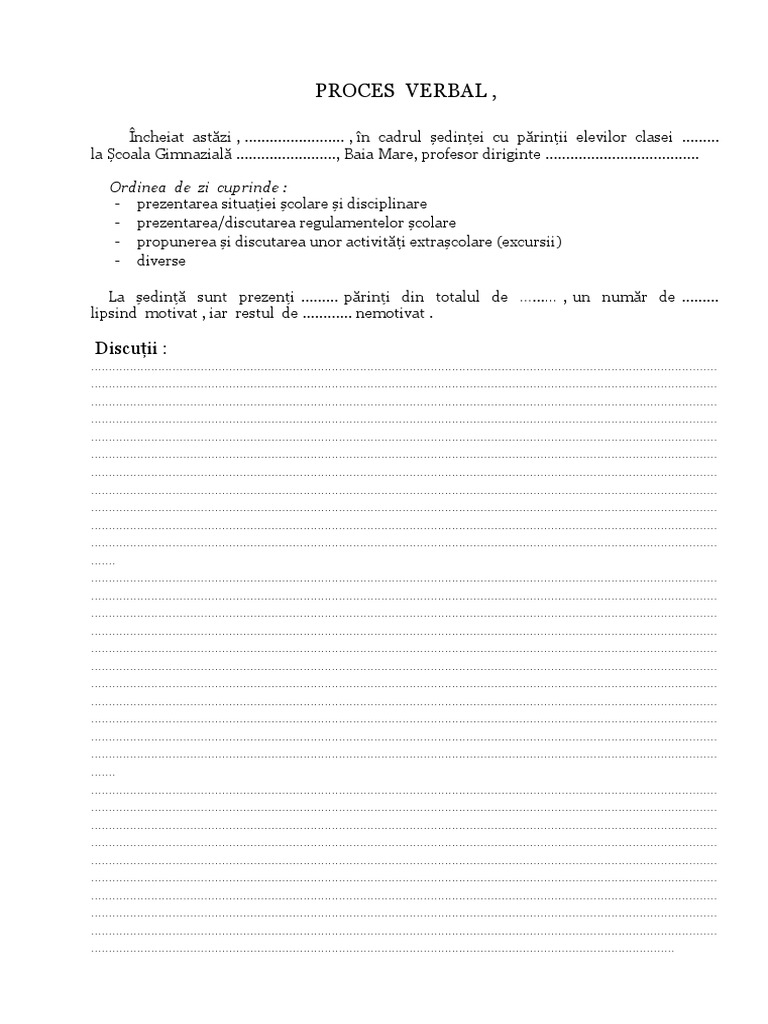 Încheiat astăzi , ........................ , în cadrul şedinţei cu părinţii elevilor clasei .........