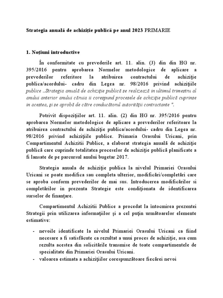 Strategia anuală de achiziţie publică pe anul 2023 PRIMARIE