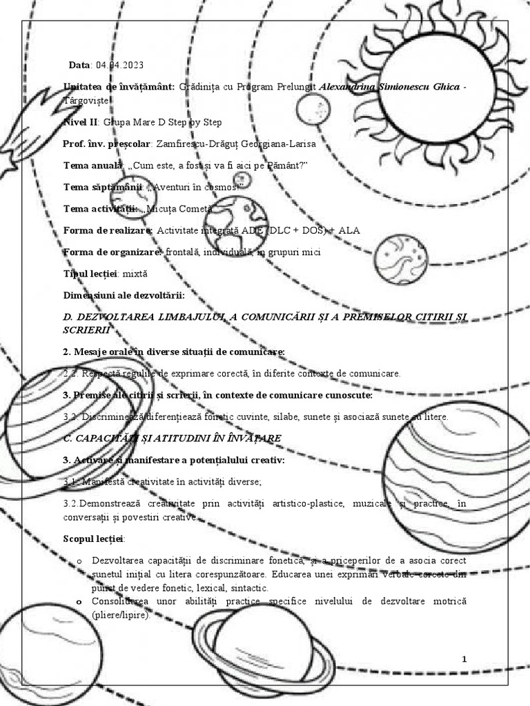 Rutine: Întâlnirea de dimineață: ,,Micuța cometă – călătorie prin sistemul solar”