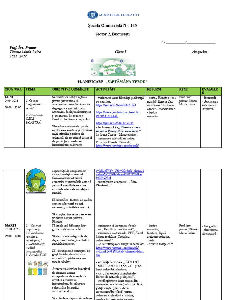 PLANIFICARE ,, SĂPTĂMÂNA VERDE”