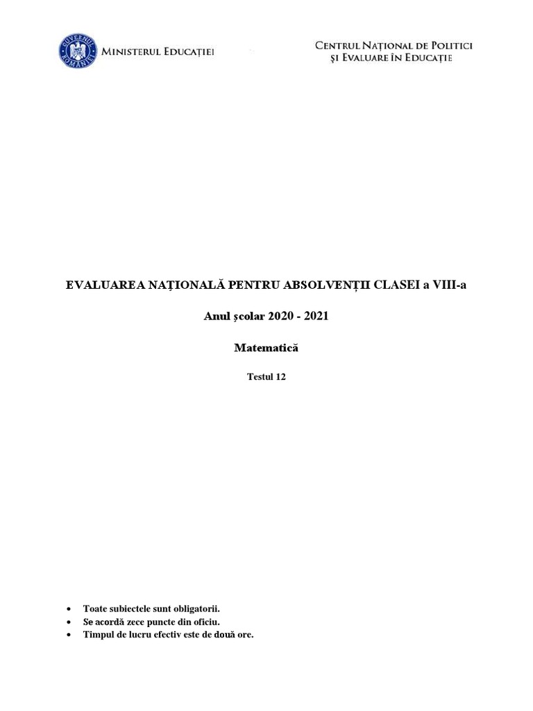 EVALUAREA NAŢIONALĂ PENTRU ABSOLVENȚII CLASEI a VIII-a
