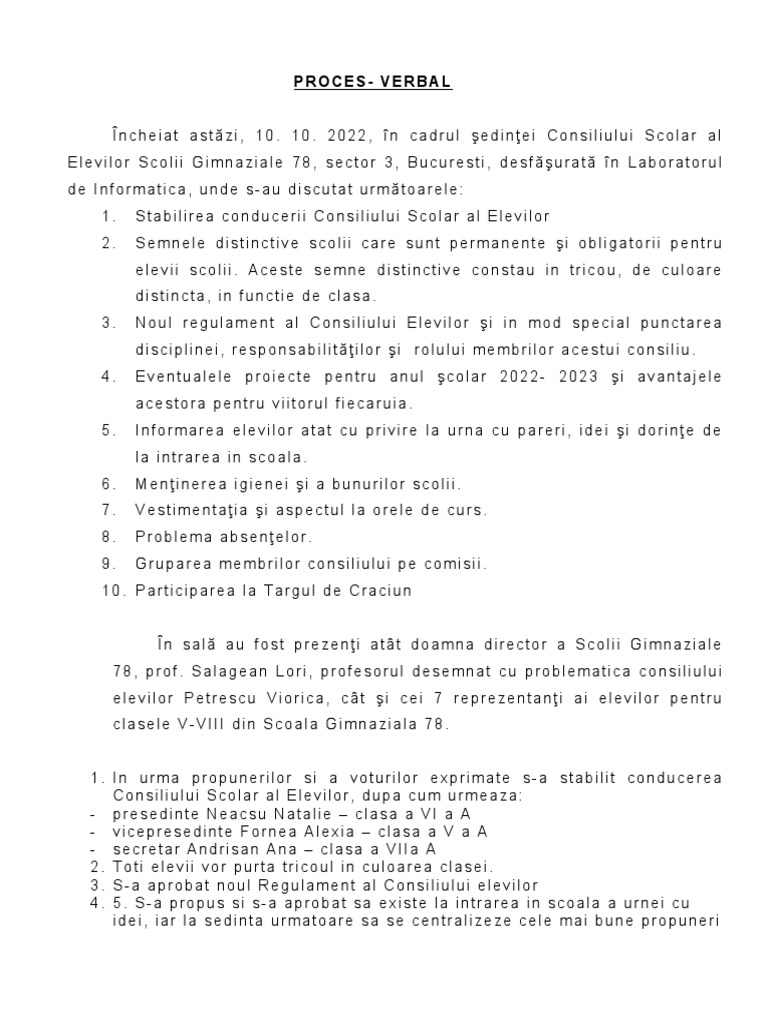 Încheiat astăzi, 10. 10. 2022, în cadrul şedinţei Consiliului Scolar al
