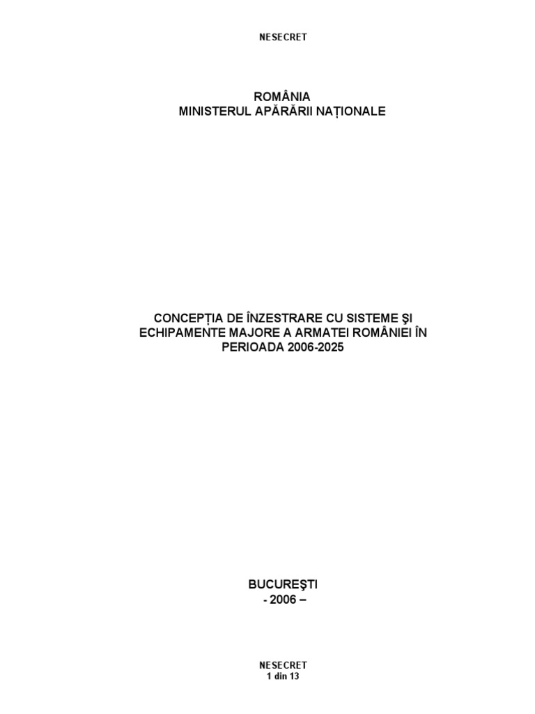 Concepţia de înzestrare a Armatei României a fost elaborată respectând