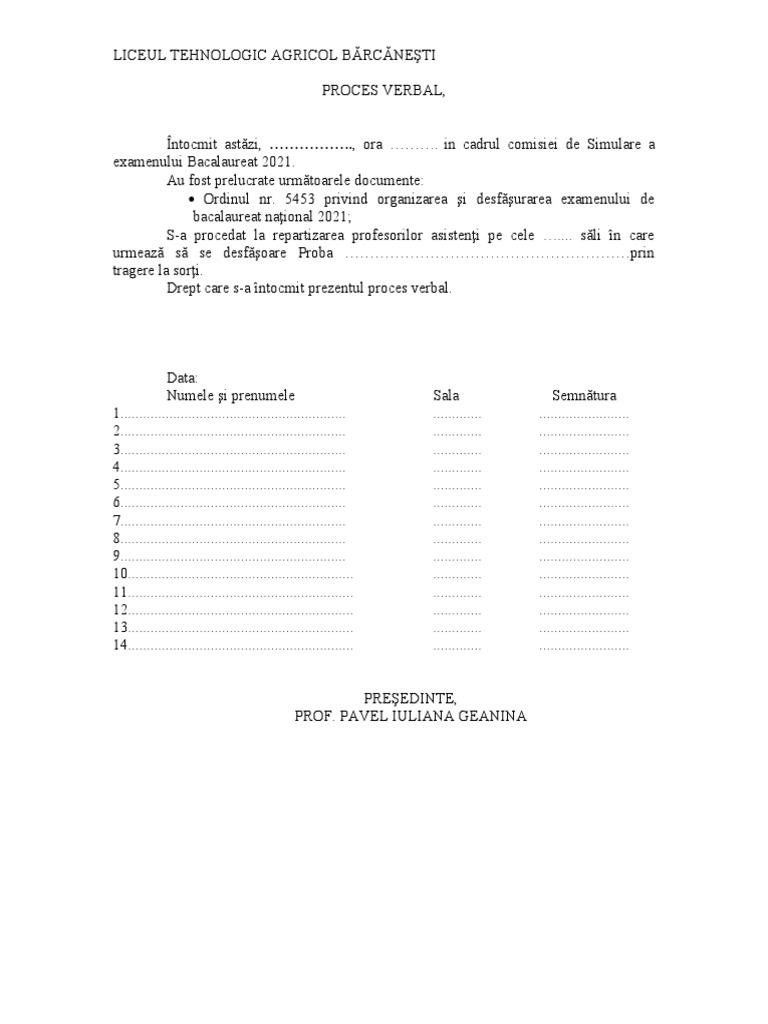 Întocmit astăzi, …………….., ora ………. in cadrul comisiei de Simulare a