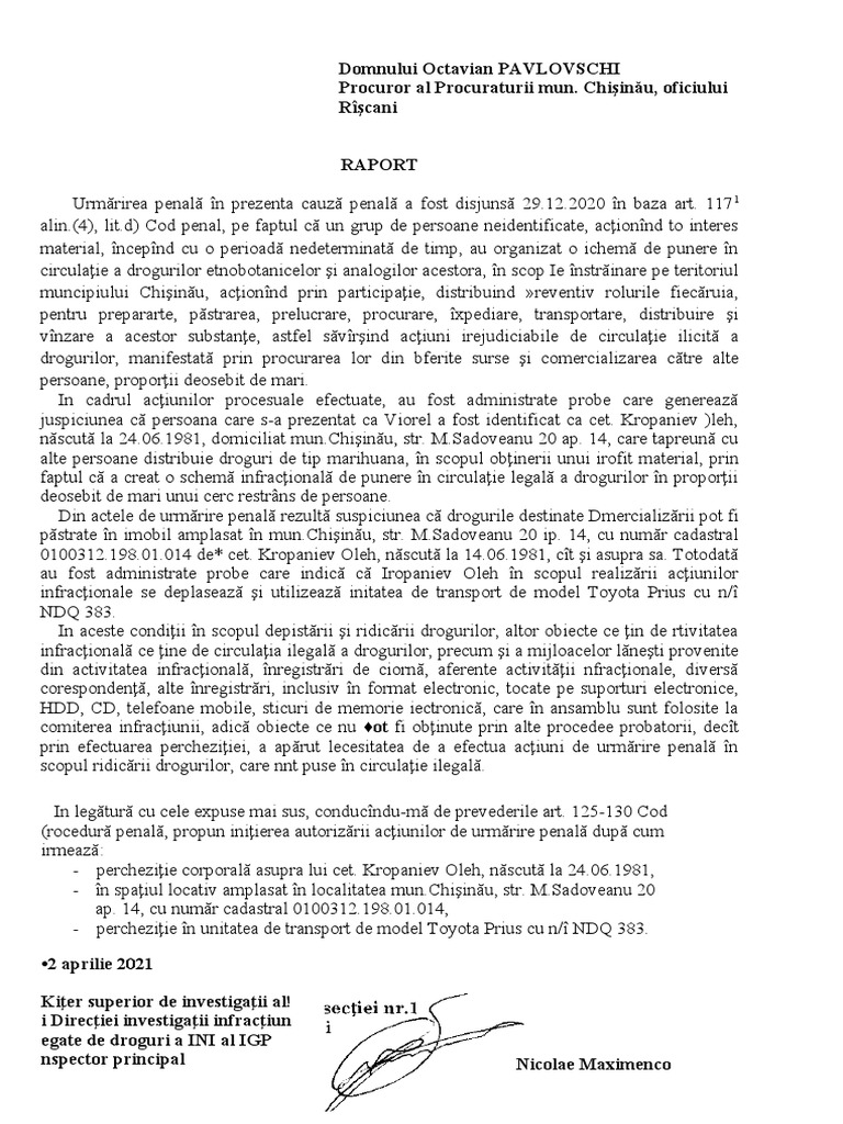 Se autorizează efectuarea percheziţiei la domiciliul cet. Kropaniev Oleh, născut