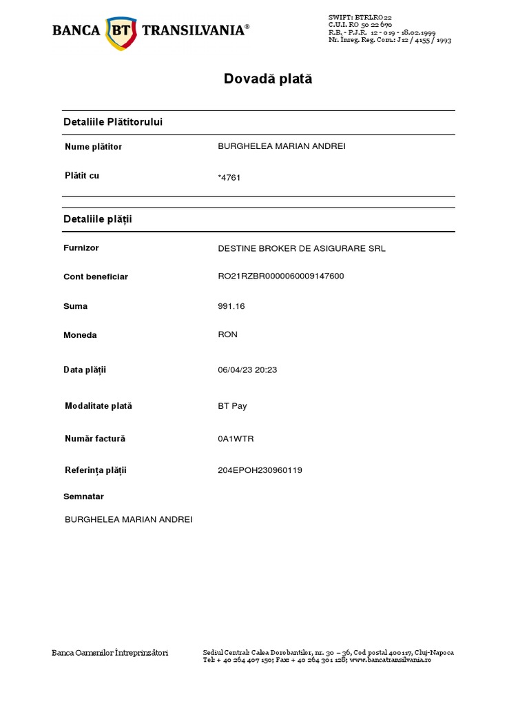 Nume plătitor BURGHELEA MARIAN ANDREI