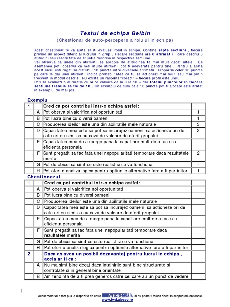 Acest chest ionar t e va aj ut a sa it i evaluezi rolul in echipa. Cont ine sa pt e se ct iuni , fiecare