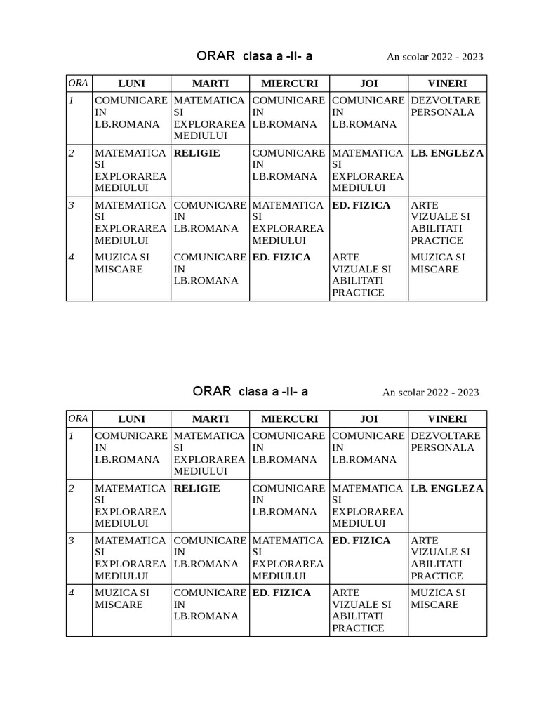 ORAR clasa a -II- a An scolar 2022 - 2023