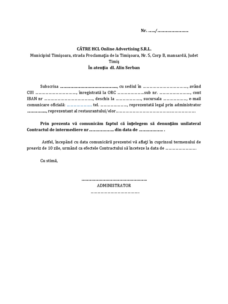 Prin prezenta vă comunicăm faptul că înţelegem să denunţăm unilateral
