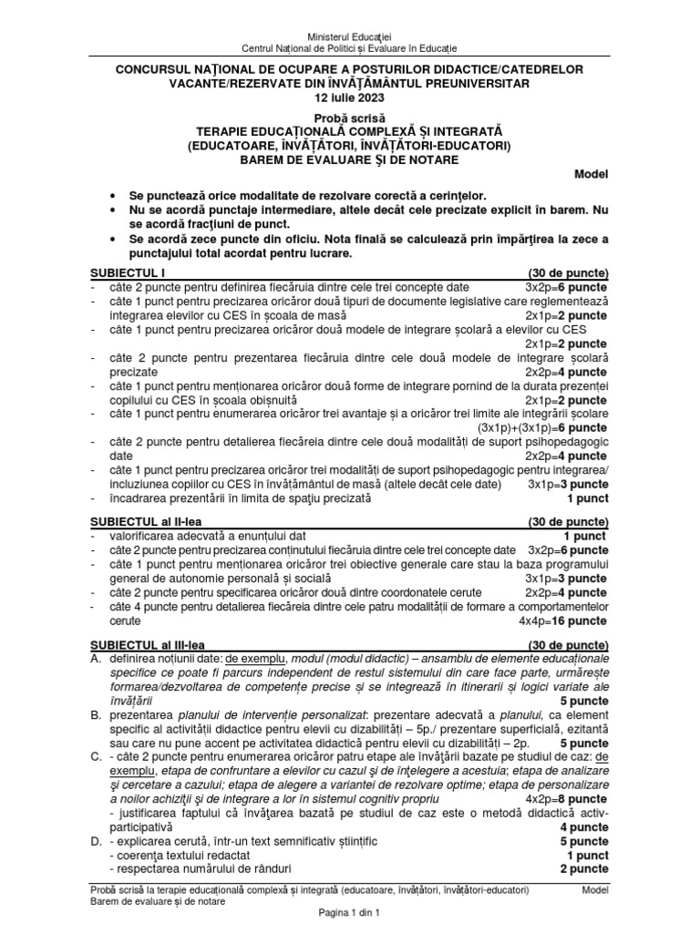 Probă scrisă la terapie educațională complexă și integrată (educatoare, învățători, învățători-educatori) Model