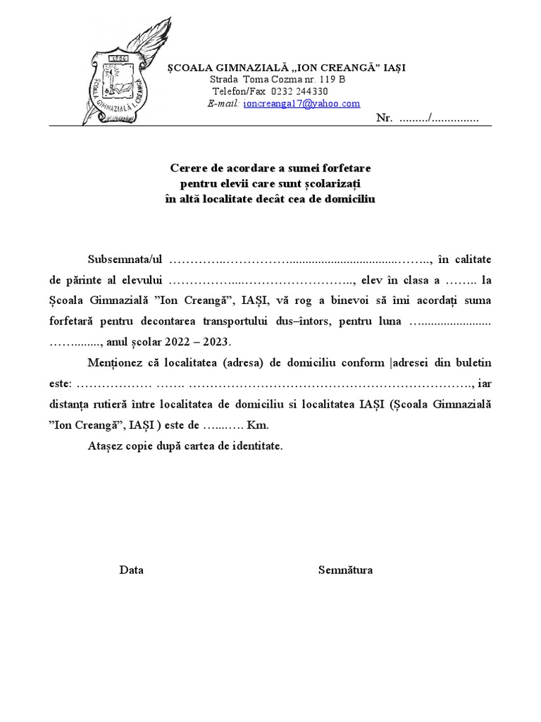 Școala Gimnazială ”Ion Creangă”, IAȘI, vă rog a binevoi să îmi acordați suma