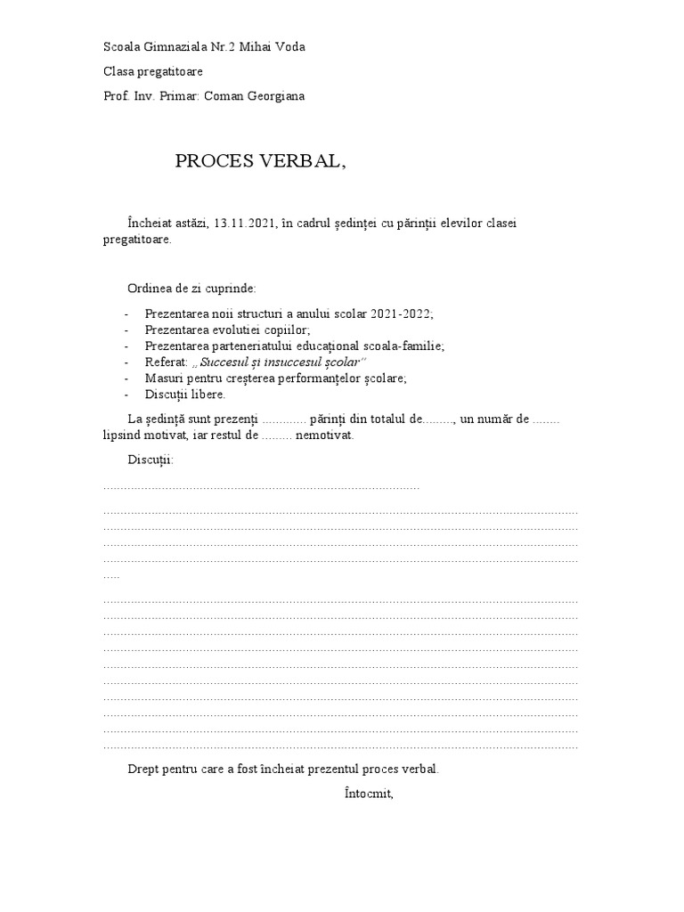 Încheiat astăzi, 13.11.2021, în cadrul ședinței cu părinții elevilor clasei
