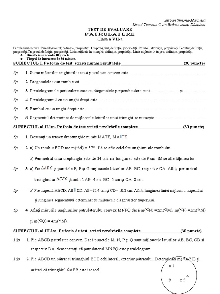 5p 2. Diagonalele unui romb sunt …...…………………………………………………………………….