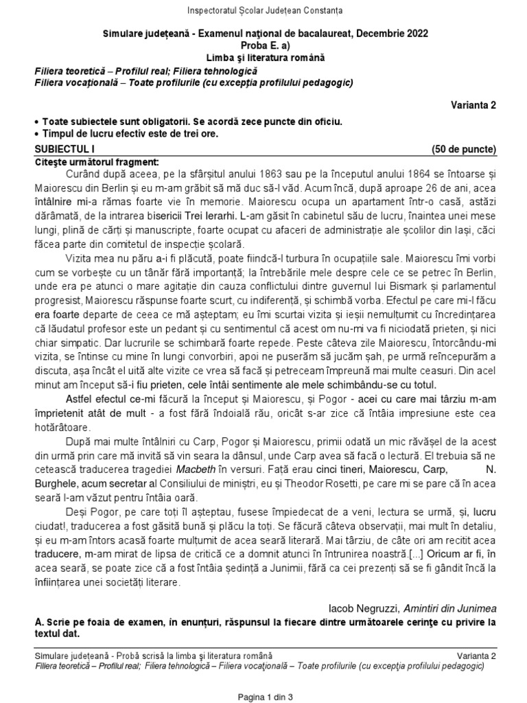 Simulare județeană - Probă scrisă la limba şi literatura română Varianta 2