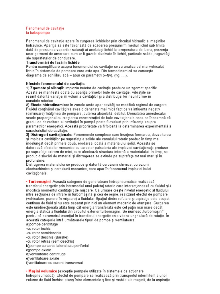 Apariia sa este favorizat de scderea presiunii n mediul lichid sub limita dat de presiunea vaporilor saturai ai aceluiai lichid la temperatura de lucru, prezena unor germeni de amorsare cum ar fi gazele dizolvate n lichid, particule solide, rugoziti ale suprafeelor de conducere. Transformri de faz n lichide Pentru exemplificare asupra fenomenului de cavitaie se va analiza cel mai vehiculat lichid n sistemele de pompare care este apa. Din termodinamic se cunoate diagrama de echilibru ap abur cu parametri p=f(v), (fig. ....). Efectele fenomenului de cavitaie. 1) Zgomote i vibraii: implozia bulelor de cavitaie produce un zgomot specific. Acesta se manifest odat cu apariia primelor bule de cavitaie. Vibraiile se resimt datorit variaiei n volum a cavitilor i a distribuiei lor neuniforme n canalele rotorice 2) Efecte hidrodinamice: n zonele unde apar caviti se modific regimul de curgere. Fluidul coninnd caviti va avea o densitate mai mic fapt ce va influena negativ (diminuare) nlimea de pompare, puterea absorbit, debitul. Densitatea amestecului scade proporional cu creterea concentraiei de bule cavitaionale ceea ce nseamn c gradul de dezvoltare al cavitaiei n pomp poate fi evaluat prin influena asupra parametrilor energetici. Aceast proprietate va fi folosit la determinarea experimental a caracteristicii de cavitaie. 3) Distrugeri cavitaionale: Fenomenele complexe care nsoesc formarea, dezvoltarea i implozia cavitilor pe suprafeele solide ale canalului rotoric produc n timp mai ndelungat dect primele dou, erodarea local a materialului solid. Aceasta se datoreaz efectelor mecanice cu caracter pulsatoriu ale imploziei cavitaionale produse pe suprafee extrem de mici, care afecteaz structura intern a materialului. n timp, se produc dislocri de material i distrugerea se extinde pe suprafee tot mai mari i n profunzime. Distrugerea materialului se produce i datorit coroziunii chimice, coroziunii electrochimice i coroziunii mecanice, care apar n fenomenul imploziei bulei cavitaionale. Turbomaini. Aceast categorie de generatoare hidropneumatice realizeaz transferul energetic prin intermediul unui paletaj rotoric care interacioneaz cu fluidul i-i modific momentul cantitii de micare. Ca urmare crete nivelul energetic al fluidului ntre seciunea de intrare n turbomain i cea de ieire, realiznd efectul de pompare (vehiculare, punere n micare) a fluidului. Spaiul dintre refulare i aspiraie este ocupat continuu de fluid i nu este separat prin nici un element mecanic de etanare. Curgerea este unidirecional atta timp ct energia transferat este cel puin mai mare dect energia static a fluidului din circuitul exterior turbomainii. Se numesc turbomaini pentru c parametrul esenial n transferul energetic este viteza unghiular de rotaie. n aceast categorie intr urmtoarele tipuri de pompe i ventilatoare: a)pompe centrifuge -cu rotor nchis -cu rotor semideschis -cu rotor deschis (Barske) -cu rotor retras (semideschis) b)pompe cu canal lateral sau periferial c)pompe axiale d)ventilatoare centrifuge e)ventilatoare axiale f)ventilatoare cu curent transversal Maini volumice (excepie pompele utilizate n sistemele de acionare hidropneumatic). Efectul de pompare se realizeaz prin transportul intermitent a unor volume de fluid nchise etan ntre elementele fixe i mobile ale mainii, de la aspiraie