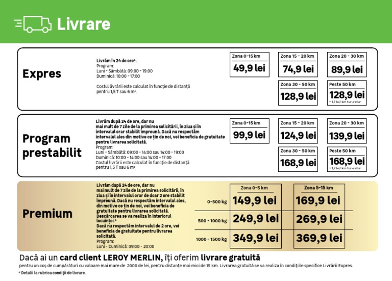 Dacă ai un card client LEROY MERLIN, îți oferim livrare gratuită