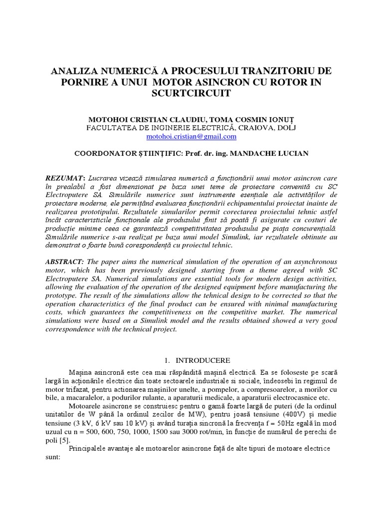 REZUMAT: Lucrarea vizează simularea numerică a funcționării unui motor asincron care