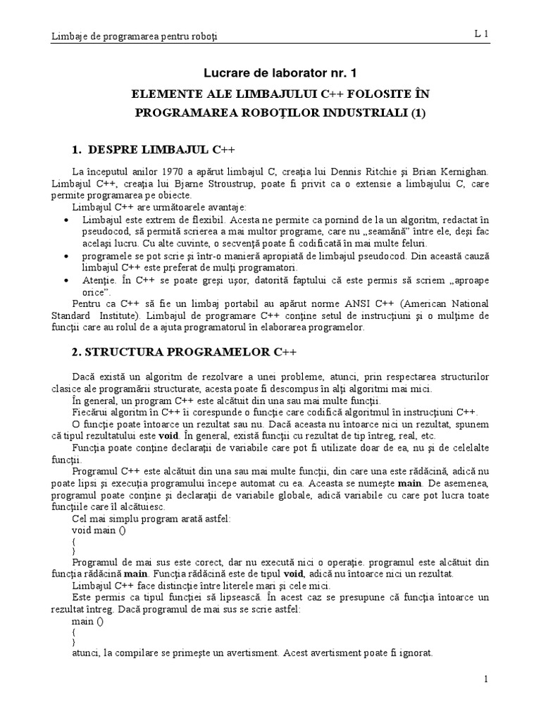 Lucrare de Laborator Nr. 1 Elemente Ale Limbajului C++ Folosite În Programarea Roboţilor Industriali (1) 1. Despre Limbajul C++