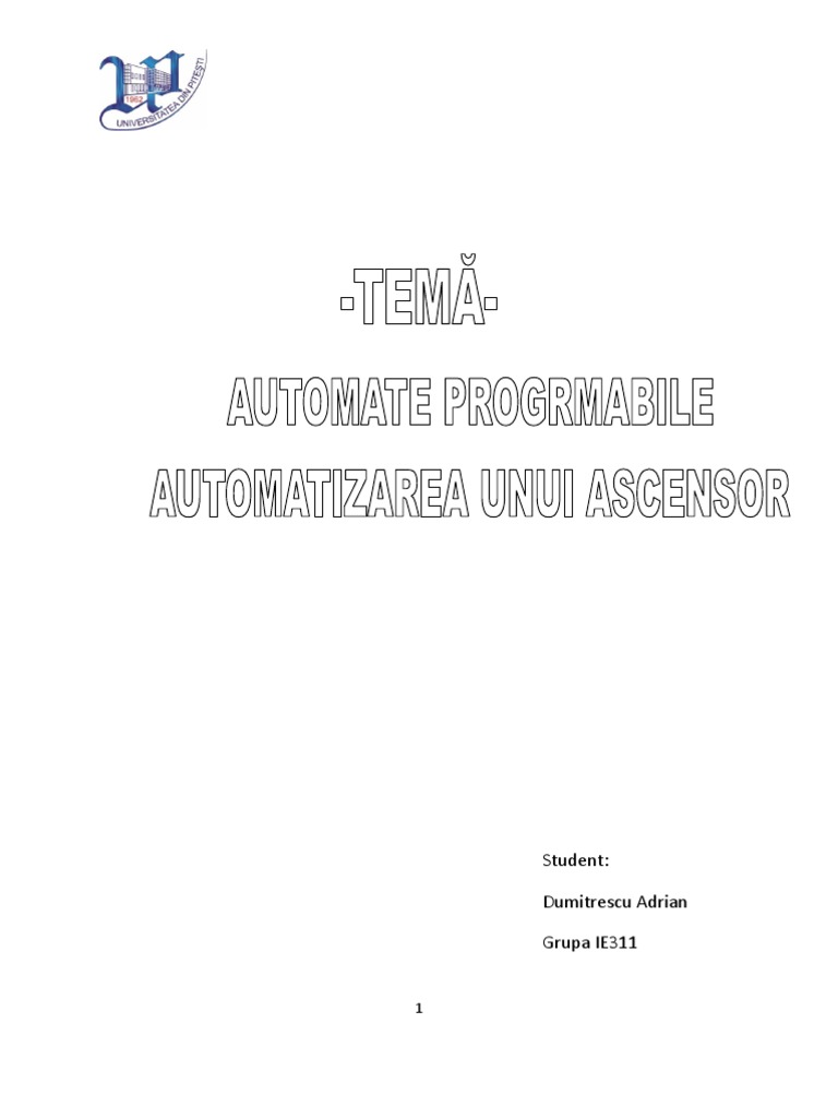 Pentru automatizarea unui ascensor cu doua etaje se determin valorile de intrare ale sistemului si relaia logic care exist intre ele. Mai jos este prezentat o schem de principiu al unui ascensor ,fiecare etaj este prevzut cu un buton de chemare al liftului,in interiorul liftului se afl dispus panou care permite selectarea etajului dorit .