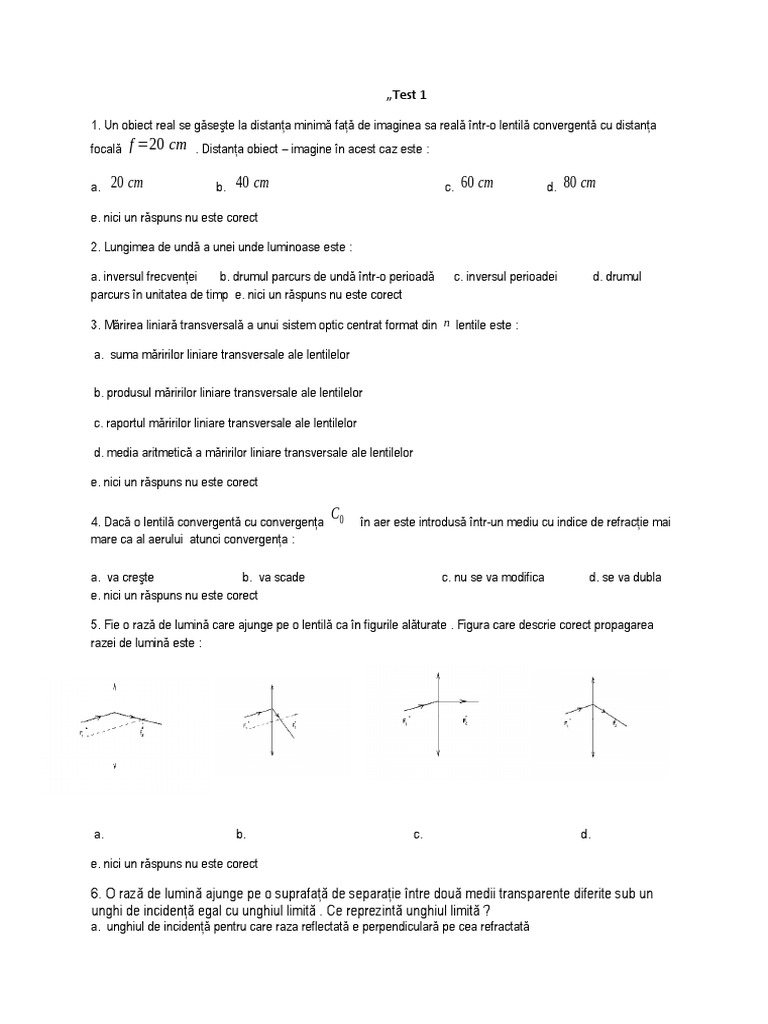 1. Un obiect real se găseşte la distanţa minimă faţă de imaginea sa reală într-o lentilă convergentă cu distanţa