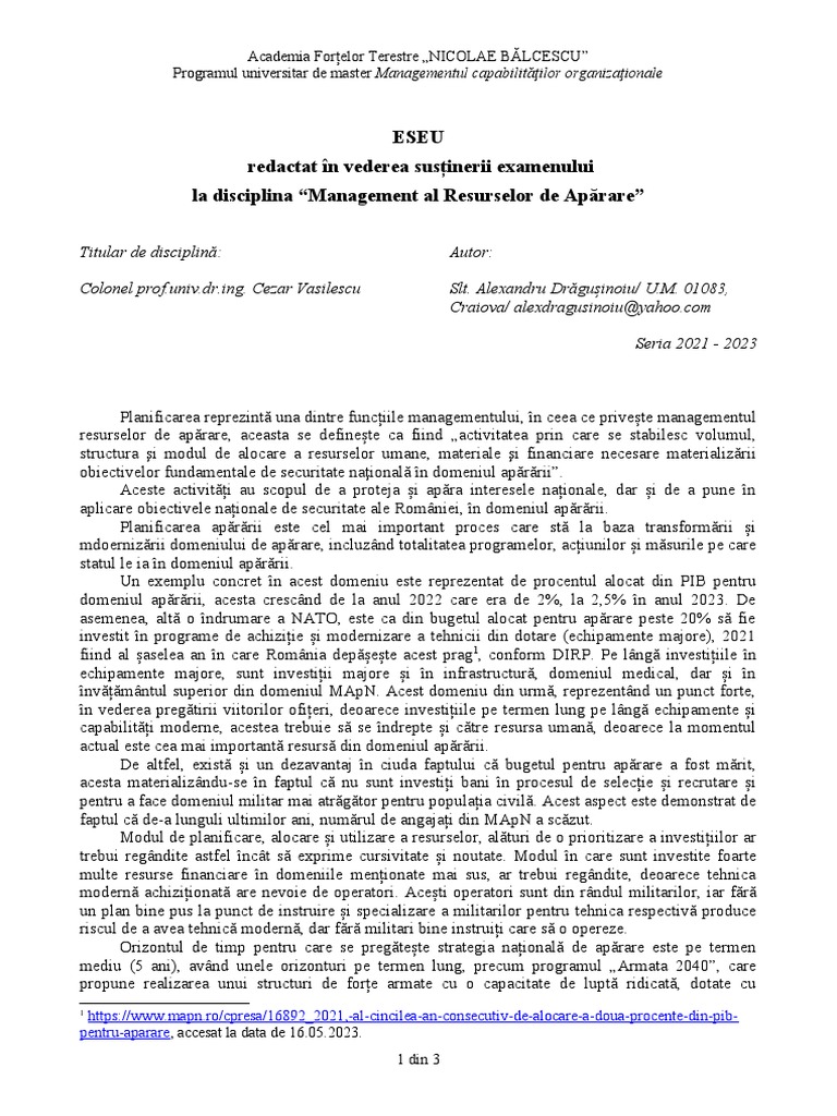 la disciplina “Management al Resurselor de Apărare”