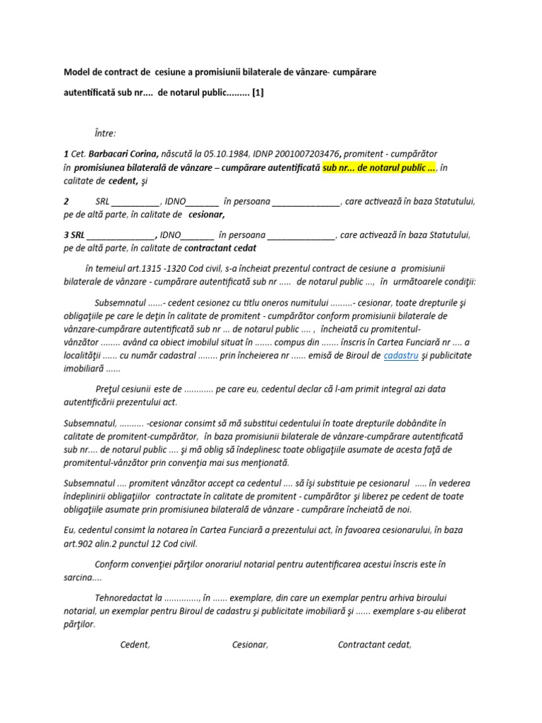 în temeiul art.1315 -1320 Cod civil, s-a încheiat prezentul contract de cesiune a promisiunii