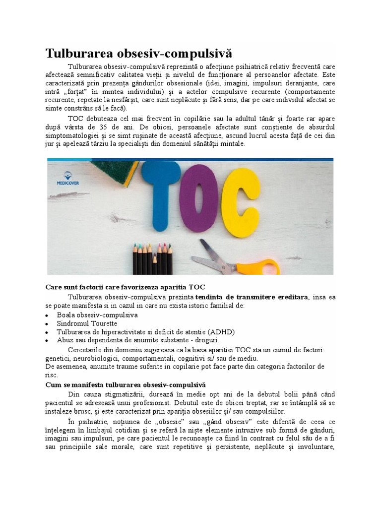 control ale tulburărilor psihice specifice afectiunii de obsesie și compulsie.
