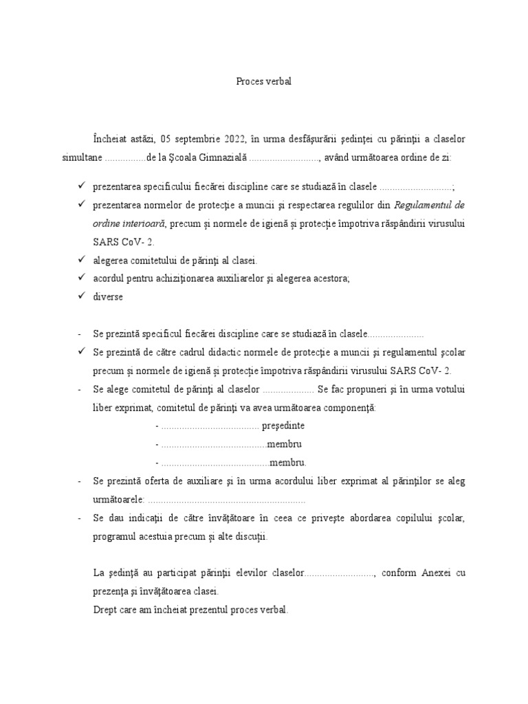 Încheiat astăzi, 05 septembrie 2022, în urma desfăşurării şedinţei cu părinţii a claselor