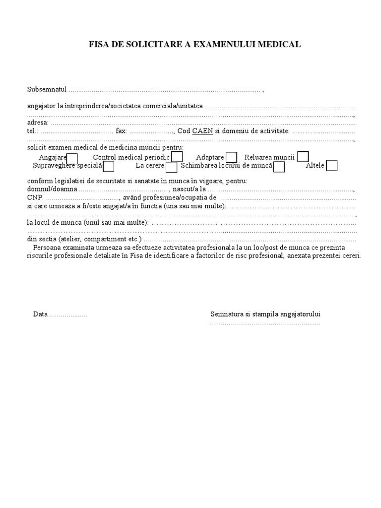 FISA DE SOLICITARE A EXAMENULUI MEDICAL