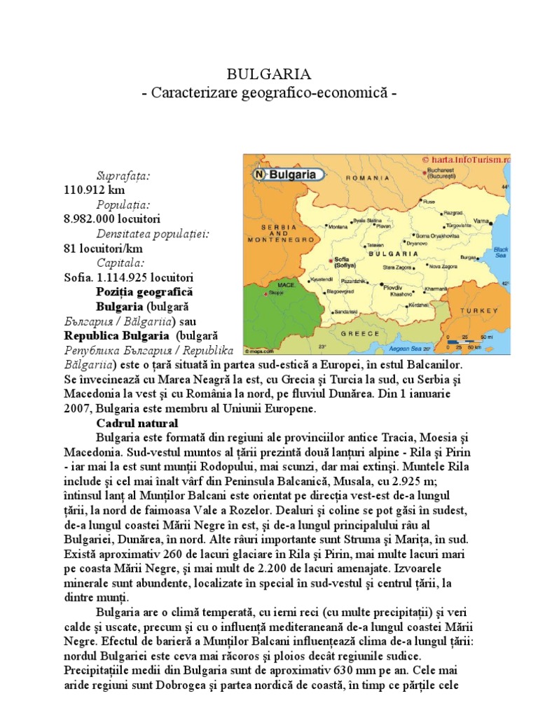Suprafaa: 110.912 km Populaia: 8.982.000 locuitori Densitatea populaiei: 81 locuitori/km Capitala: Sofia. 1.114.925 locuitori Poziia geografic Bulgaria (bulgar / Blgariia) sau Republica Bulgaria (bulgar / Republika Blgariia) este o ar situat n partea sud-estic a Europei, n estul Balcanilor. Se nvecineaz cu Marea Neagr la est, cu Grecia i Turcia la sud, cu Serbia i Macedonia la vest i cu Romnia la nord, pe fluviul Dunrea. Din 1 ianuarie 2007, Bulgaria este membru al Uniunii Europene. Cadrul natural Bulgaria este format din regiuni ale provinciilor antice Tracia, Moesia i Macedonia. Sud-vestul muntos al rii prezint dou lanuri alpine - Rila i Pirin - iar mai la est sunt munii Rodopului, mai scunzi, dar mai extini. Muntele Rila include i cel mai nalt vrf din Peninsula Balcanic, Musala, cu 2.925 m; ntinsul lan al Munilor Balcani este orientat pe direcia vest-est de-a lungul rii, la nord de faimoasa Vale a Rozelor. Dealuri i coline se pot gsi n sudest, de-a lungul coastei Mrii Negre n est, i de-a lungul principalului ru al Bulgariei, Dunrea, n nord. Alte ruri importante sunt Struma i Maria, n sud. Exist aproximativ 260 de lacuri glaciare n Rila i Pirin, mai multe lacuri mari pe coasta Mrii Negre, i mai mult de 2.200 de lacuri amenajate. Izvoarele minerale sunt abundente, localizate n special n sud-vestul i centrul rii, la dintre muni. Bulgaria are o clim temperat, cu ierni reci (cu multe precipitaii) i veri calde i uscate, precum i cu o influen mediteranean de-a lungul coastei Mrii Negre. Efectul de barier a Munilor Balcani influeneaz clima de-a lungul rii: nordul Bulgariei este ceva mai rcoros i ploios dect regiunile sudice. Precipitaiile medii din Bulgaria sunt de aproximativ 630 mm pe an. Cele mai aride regiuni sunt Dobrogea i partea nordic de coast, n timp ce prile cele