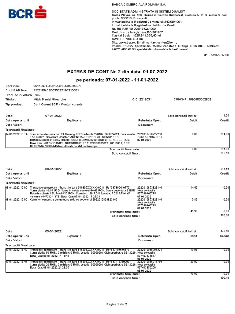 07-01-2022 16:14 Tranzactie efectuata prin 24 Banking BCR Referinta 220107S923824821, data valutei 2022010750929238 0,00 214,00