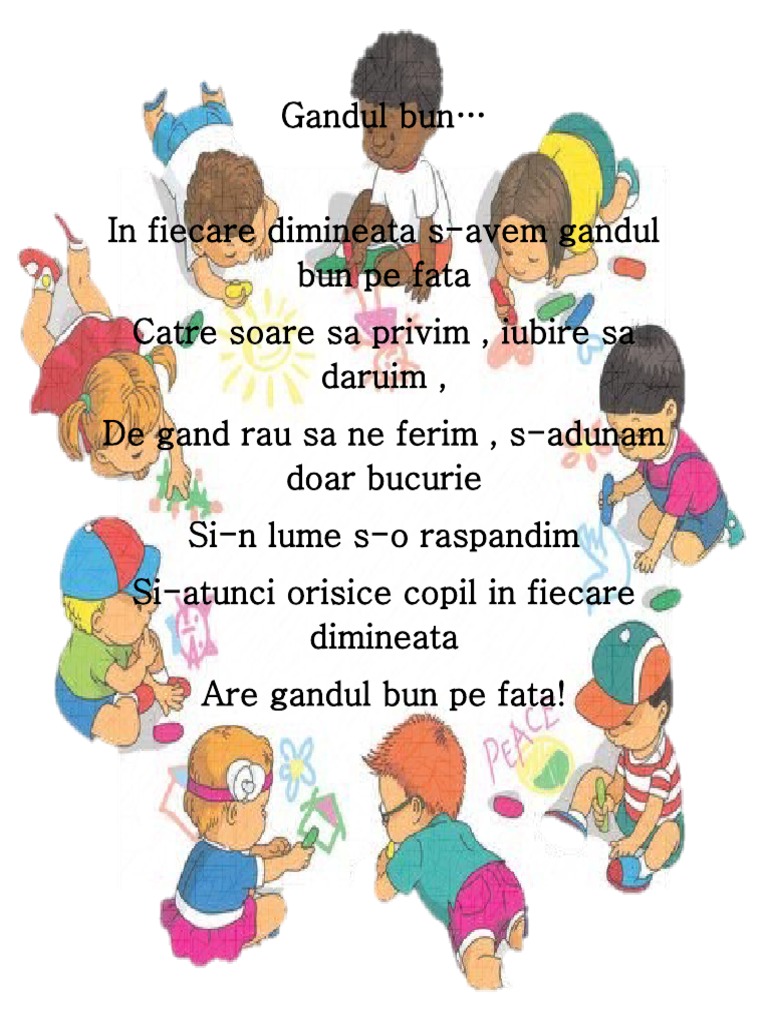bun pe fata Catre soare sa privim , iubire sa daruim , De gand rau sa ne ferim , s-adunam doar bucurie Si-n lume s-o raspandim Si-atunci orisice copil in fiecare dimineata Are gandul bun pe fata!