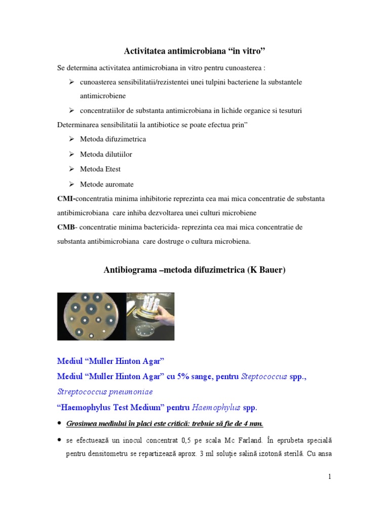 Se determina activitatea antimicrobiana in vitro pentru cunoasterea : cunoasterea sensibilitatii/rezistentei unei tulpini bacteriene la substantele antimicrobiene concentratiilor de substanta antimicrobiana in lichide organice si tesuturi Determinarea sensibilitatii la antibiotice se poate efectua prin Metoda difuzimetrica Metoda dilutiilor Metoda Etest Metode auromate CMI-concentratia minima inhibitorie reprezinta cea mai mica concentratie de substanta antibimicrobiana care inhiba dezvoltarea unei culturi microbiene CMB- concentratie minima bactericida- reprezinta cea mai mica concentratie de substanta antibimicrobiana care dostruge o cultura microbiena.