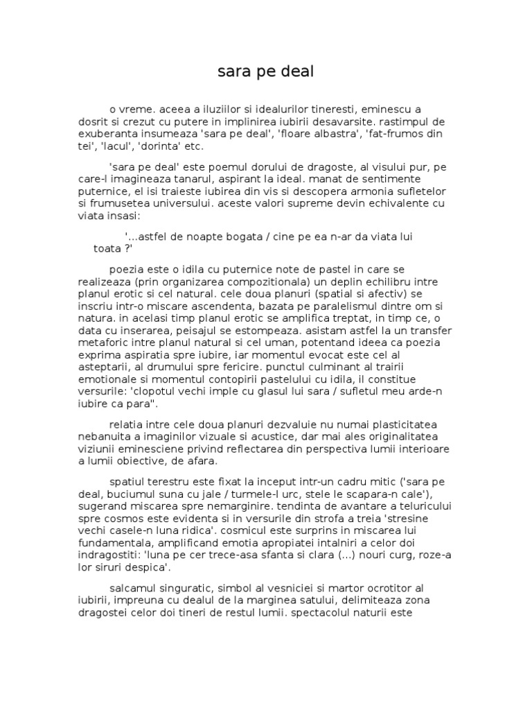 'sara pe deal' este poemul dorului de dragoste, al visului pur, pe