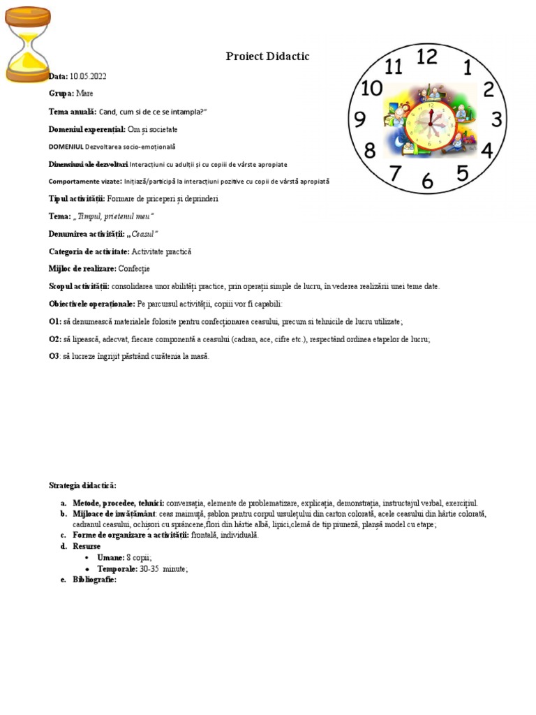 b. Mijloace de învățământ: ceas maimuță, șablon pentru corpul ursulețului din carton colorată, acele ceasului din hârtie colorată,