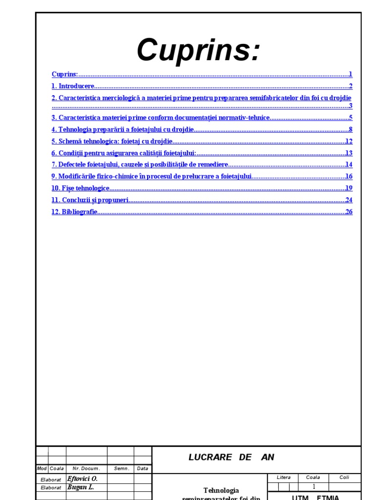 Cuprins:.........................................................................................................................................................1 1. Introducere................................................................................................................................................2 2. Caracteristica merciologic a materiei prime pentru prepararea semifabricatelor din foi cu drojdie ........................................................................................................................................................................3 3. Caracteristica materiei prime conform documentaiei normativ-tehnice.............................................5 4. Tehnologia preparrii a foietajului cu drojdie........................................................................................8 5. Schem tehnologica: foietaj cu drojdie..................................................................................................12 6. Condiii pentru asigurarea calitii foietajului:....................................................................................13 7. Defectele foietajului, cauzele i posibilitile de remediere..................................................................14 9. Modificrile fizico-chimice n procesul de prelucrare a foietajului.....................................................16 10. Fie tehnologice.....................................................................................................................................19 11. Concluzii i propuneri...........................................................................................................................24 12. Bibliografie............................................................................................................................................26