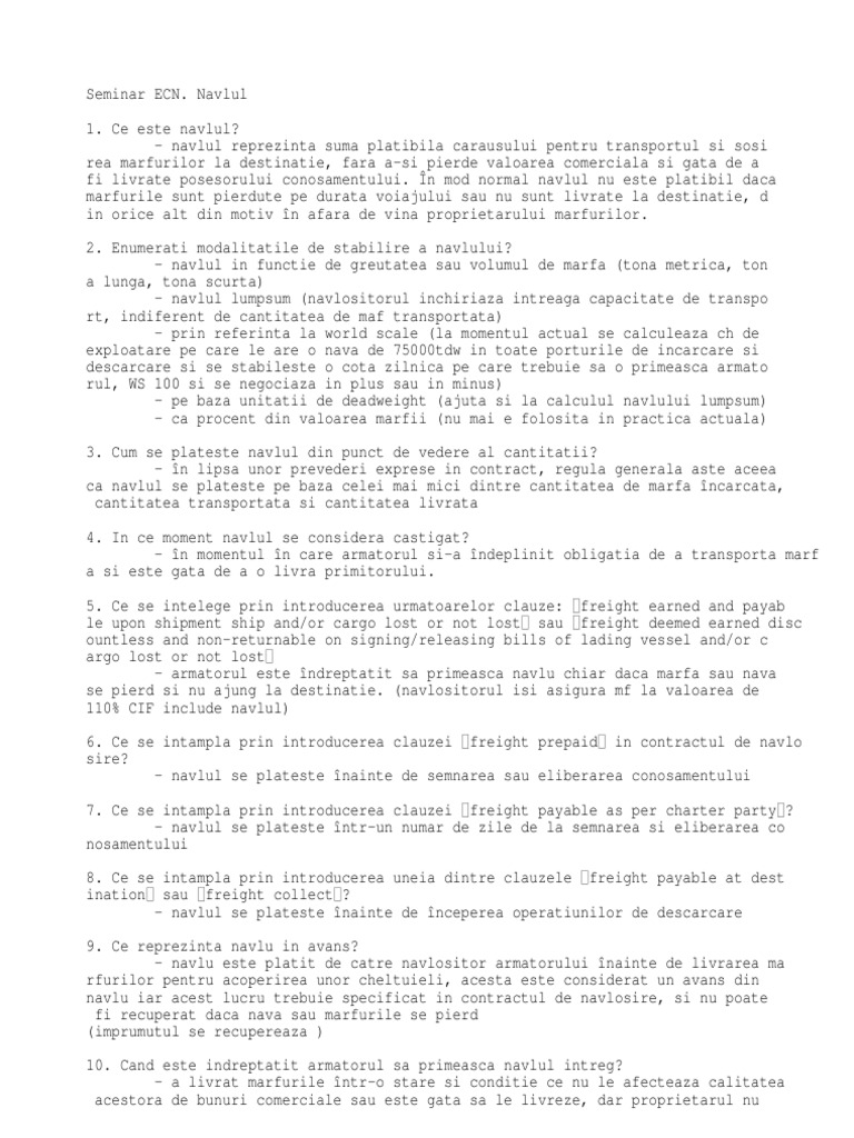 - navlul reprezinta suma platibila carausului pentru transportul si sosi rea marfurilor la destinatie, fara a-si pierde valoarea comerciala si gata de a fi livrate posesorului conosamentului. n mod normal navlul nu este platibil daca marfurile sunt pierdute pe durata voiajului sau nu sunt livrate la destinatie, d in orice alt din motiv n afara de vina proprietarului marfurilor. 2. Enumerati modalitatile de stabilire a navlului? - navlul in functie de greutatea sau volumul de marfa (tona metrica, ton a lunga, tona scurta) - navlul lumpsum (navlositorul inchiriaza intreaga capacitate de transpo rt, indiferent de cantitatea de maf transportata) - prin referinta la world scale (la momentul actual se calculeaza ch de exploatare pe care le are o nava de 75000tdw in toate porturile de incarcare si descarcare si se stabileste o cota zilnica pe care trebuie sa o primeasca armato rul, WS 100 si se negociaza in plus sau in minus) - pe baza unitatii de deadweight (ajuta si la calculul navlului lumpsum) - ca procent din valoarea marfii (nu mai e folosita in practica actuala) 3. Cum se plateste navlul din punct de vedere al cantitatii? - n lipsa unor prevederi exprese in contract, regula generala aste aceea ca navlul se plateste pe baza celei mai mici dintre cantitatea de marfa ncarcata, cantitatea transportata si cantitatea livrata 4. In ce moment navlul se considera castigat? - n momentul n care armatorul si-a ndeplinit obligatia de a transporta marf a si este gata de a o livra primitorului. 5. Ce se intelege prin introducerea urmatoarelor clauze: freight earned and payab le upon shipment ship and/or cargo lost or not lost sau freight deemed earned disc ountless and non-returnable on signing/releasing bills of lading vessel and/or c argo lost or not lost - armatorul este ndreptatit sa primeasca navlu chiar daca marfa sau nava se pierd si nu ajung la destinatie. (navlositorul isi asigura mf la valoarea de 110% CIF include navlul) 6. Ce se intampla prin introducerea clauzei freight prepaid in contractul de navlo sire? - navlul se plateste nainte de semnarea sau eliberarea conosamentului 7. Ce se intampla prin introducerea clauzei freight payable as per charter party ? - navlul se plateste ntr-un numar de zile de la semnarea si eliberarea co nosamentului 8. Ce se intampla prin introducerea uneia dintre clauzele freight payable at dest ination sau freight collect ? - navlul se plateste nainte de nceperea operatiunilor de descarcare 9. Ce reprezinta navlu in avans? - navlu este platit de catre navlositor armatorului nainte de livrarea ma rfurilor pentru acoperirea unor cheltuieli, acesta este considerat un avans din navlu iar acest lucru trebuie specificat in contractul de navlosire, si nu poate fi recuperat daca nava sau marfurile se pierd (imprumutul se recupereaza ) 10. Cand este indreptatit armatorul sa primeasca navlul intreg? - a livrat marfurile ntr-o stare si conditie ce nu le afecteaza calitatea acestora de bunuri comerciale sau este gata sa le livreze, dar proprietarul nu