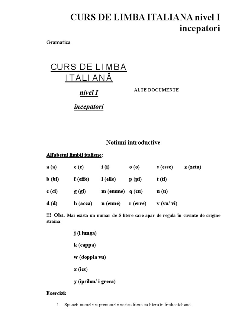 CURS DE LIMBA ITALIANA nivel I