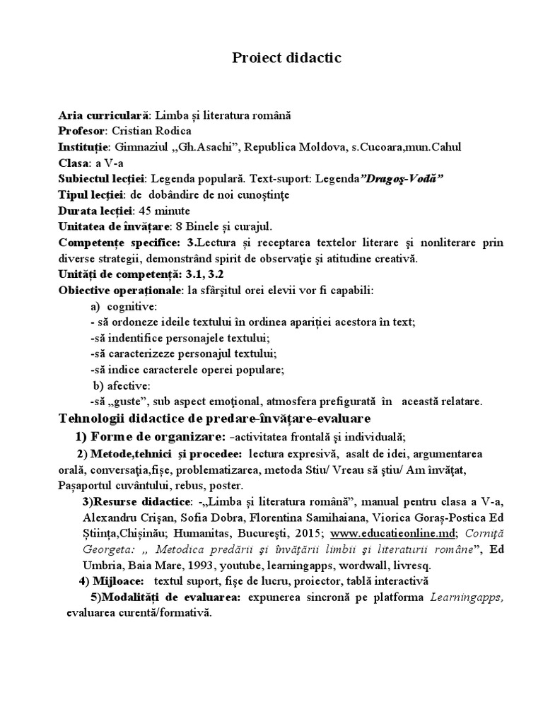 3)Resurse didactice: -„Limba și literatura română”, manual pentru clasa a V-a,