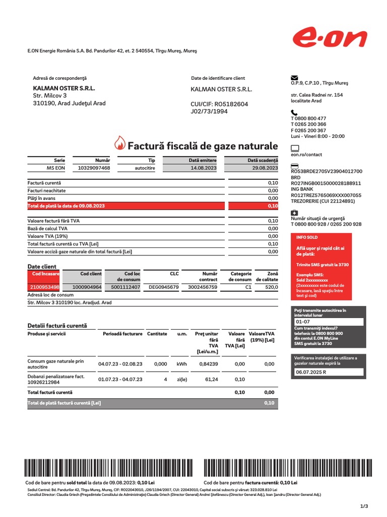 Cod de bare pentru sold total la data de 09.08.2023: 0,10 Lei Cod de bare pentru factura curentă: 0,10 Lei