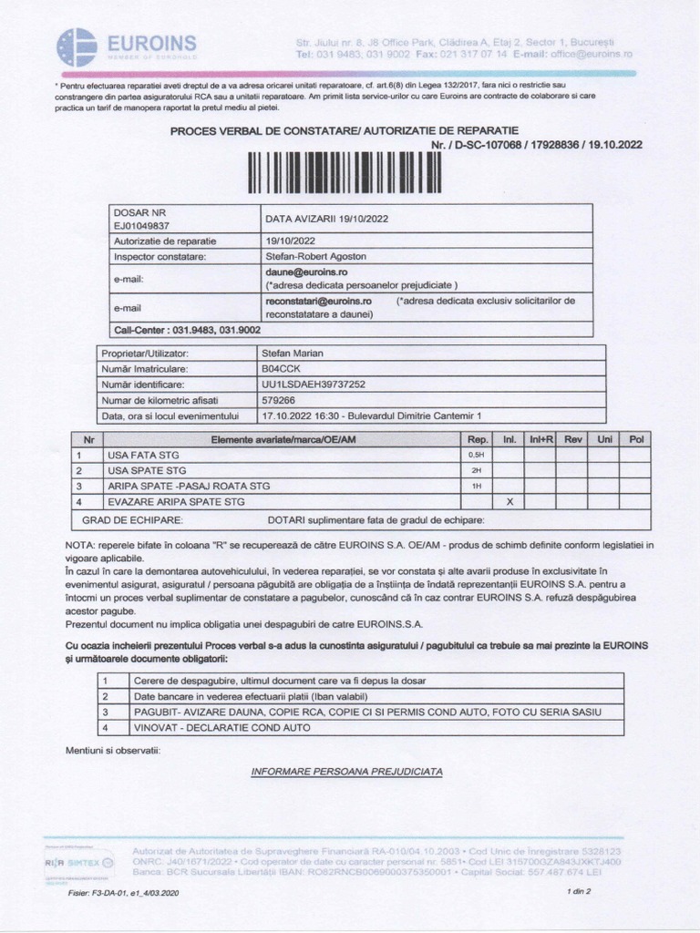 ‘ntocmi un proces verbal supimentar de constatare a pagubelor, cunoscénd ca in caz contrar EUROINS S.A. refuza despagubirea