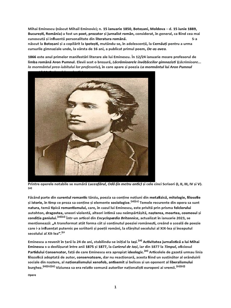 1866 este anul primelor manifestări literare ale lui Eminescu. În 12/24 ianuarie moare profesorul de