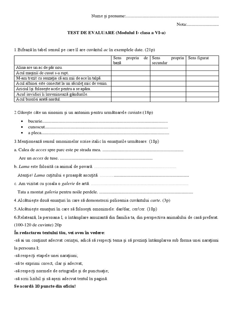 TEST DE EVALUARE (Modulul I- clasa a VI-a)